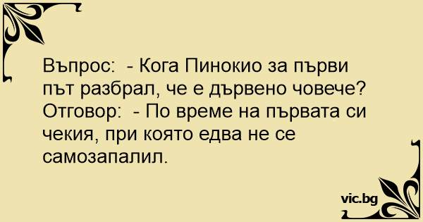 Въпрос: - Кога Пинокио за първи път разбрал, че е дървено човече?