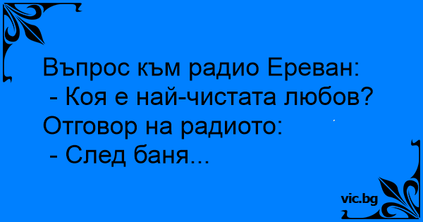 Въпрос към радио Ереван: - Коя е най-чистата любов?Отговор на радиото: - След баня... 3 0 0 Вицове: Въпроси и Отговори