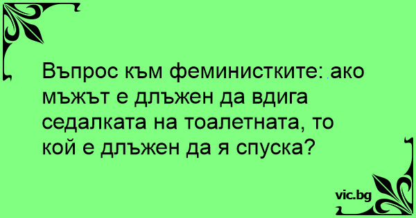Въпрос към феминистките: ако мъжът е длъжен да вдига седалката на тоалетната, то кой е длъжен да я спуска?