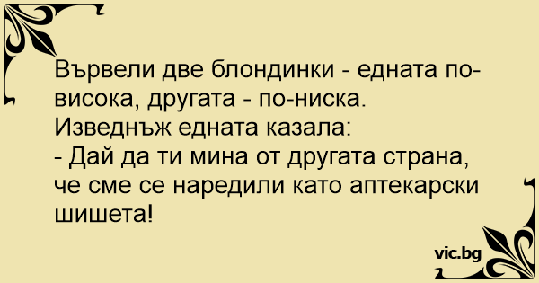 Вървели две блондинки - едната по-висока, другата - по-ниска.