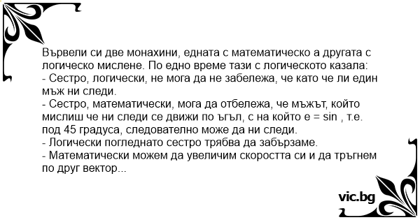 - Математически сестро твоята теория е вярна, математически трябва да се срещнем пред манастира след 30 минути.