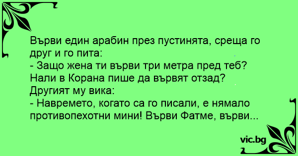 Egy arab sejk sétál a szaudi sivatagban, előtte 50 méterrel megy a felesége. Szembejön egy másik sejk, s méltatlankodva felkiált: - Mit csinálsz, Ahmed? Meg vagyon írva a Koránban, hogy az...
