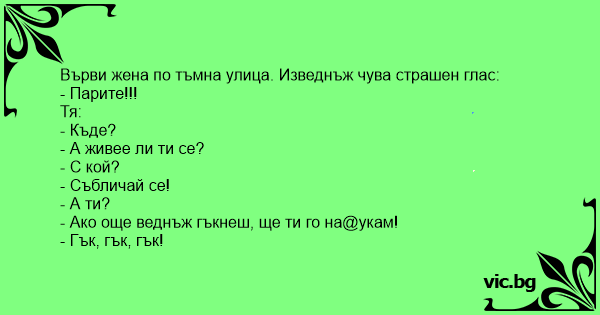 Върви жена по тъмна улица. Изведнъж чува страшен глас: