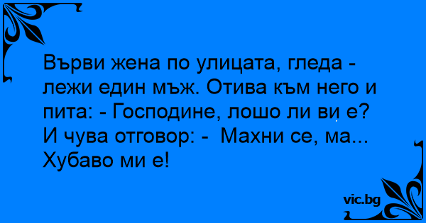 Върви жена по улицата, гледа - лежи един мъж. Отива към него и пита: - Господине, лошо ли ви е?
