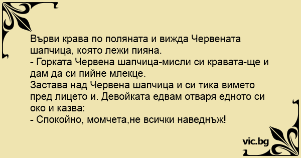 Върви крава по поляната и вижда Червената шапчица, която лежи пияна.