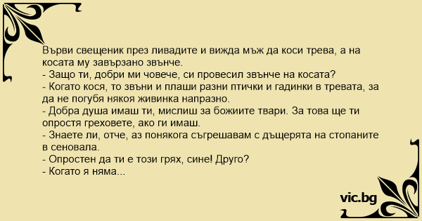 Върви свещеник през ливадите и вижда мъж да коси трева, а на косата му завързано звънче.