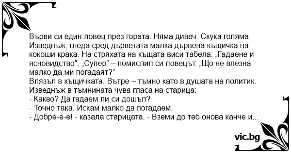Върви си един ловец през гората. Няма дивеч. Скука голяма. Изведнъж, гледа сред дърветата малка дървена къщичка на кокоши крака. На стряхата на къщата виси табела: „Гадаене и ясновидство”. „Супер” – помислил си ловецът. „Що не влезна малко да ми погадаят?”