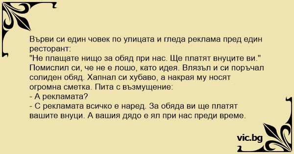 - С рекламата всичко е наред. За обяда ви ще платят вашите внуци. А вашия дядо е ял при нас преди време.