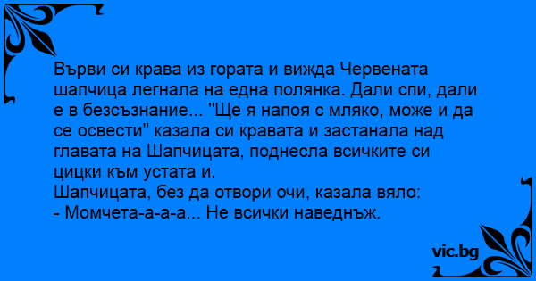 Върви си крава из гората и вижда Червената шапчица легнала на една полянка. Дали спи, дали е в безсъзнание... "Ще я напоя с мляко, може и да се освести" казала си кравата и застанала над главата на Шапчицата, поднесла всичките си цицки към устата и.