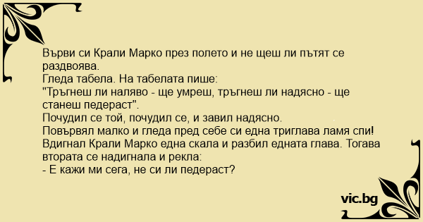 Върви Крали Марко из гората и стига до разклонение на пътя и чете табелката: