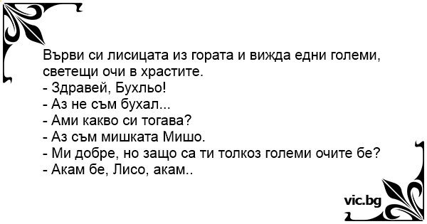 Върви си лисицата из гората и вижда едни големи, светещи очи в храстите.