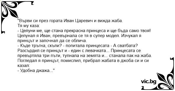 Целунал я Иван, превърнала се тя в супер модел. Изчуkaл я принцът и започнал да се облича.