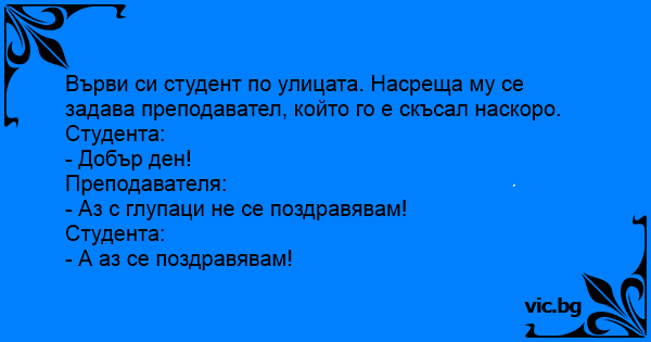 Върви си студент по улицата. Насреща му се задава преподавател, който го е скъсал наскоро.