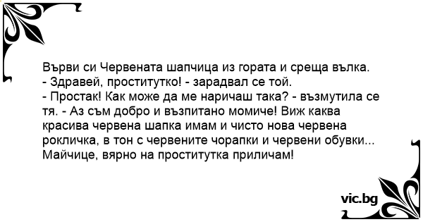 - Простак! Как може да ме наричаш така? - възмутила се тя. - Аз съм добро и възпитано момиче! Виж каква красива червена шапка имам и чисто нова червена рокличка, в тон с червените чорапки и червени обувки... Майчице, вярно на проститутка приличам!