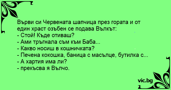 Върви си Червената шапчица през гората и от един храст озъбен се подава Вълкът:
