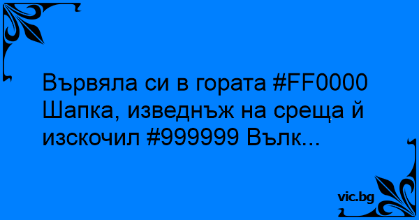 Вървяла си в гората #FF0000 Шапка, изведнъж на среща й изскочил #999999 Вълк...