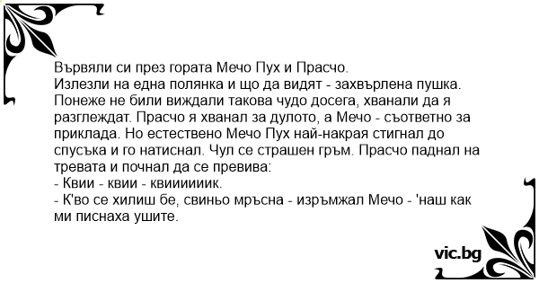 - К'во се хилиш бе, свиньо мръсна - изръмжал Мечо - 'наш как ми писнаха ушите.