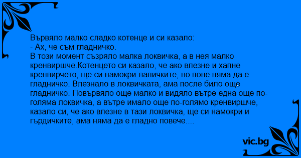В този момент съзряло малка локвичка, а в нея малко кренвиршче.Котенцето си казало, че ако влезне и хапне кренвирчето, ще си намокри лапичките, но поне няма да е гладничко. Влезнало в локвичката, ама после било още гладничко. Повървяло още малко и видяло вътре една още по-голяма локвичка, а вътре имало още по-голямо кренвиршче, казало си, че ако влезне в тази локвичка, ще си намокри и гърдичките, ама няма да е гладно повече. Хапнало кренвирша, ама пак останало гладничко. По-нататък по улицата видяло още една локва, в нея пък имало един огромен кренвирш, котето си казало, че ще се намокри цялото, ако влезне, ама няма да чувства повече глад.