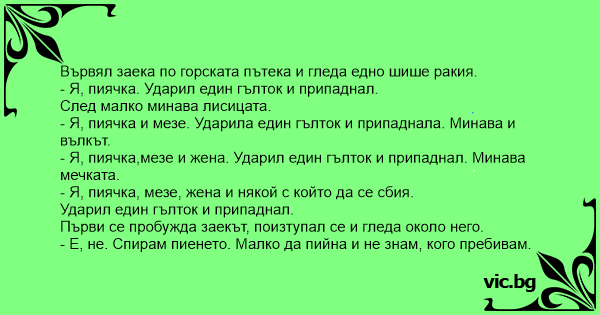 Вървял заека по горската пътека и гледа едно шише ракия.