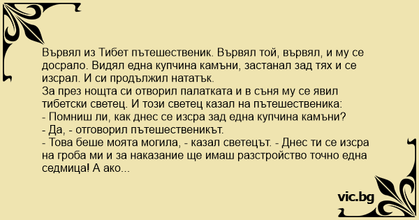 Вървял из Тибет пътешественик. Вървял той, вървял, и му се досрало. Видял една купчина камъни, застанал зад тях и се изcpaл. И си продължил нататък.