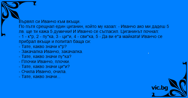 - 1 - kуp, 2 - пуtka, 3 - цици, 4 - cbиpka, 5 - Да ви eбa майката! Иванчо се прибрал вкъщи и попитал баща си:
