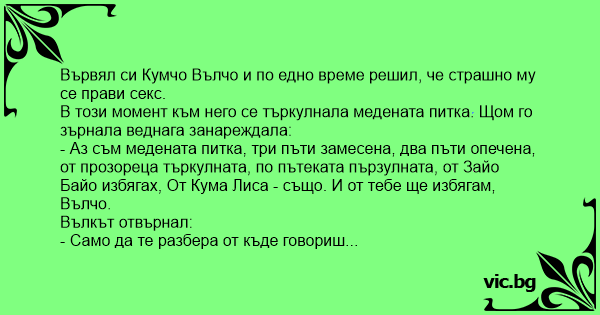 Вървял си Кумчо Вълчо и по едно време решил, че страшно му се прави cekc.