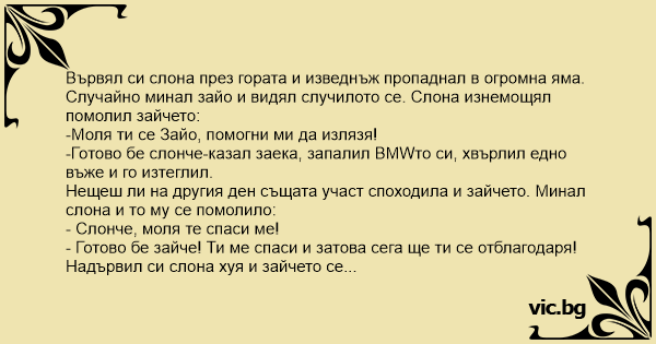 -Готово бе слонче-казал заека, запалил BMWто си, хвърлил едно въже и го изтеглил.