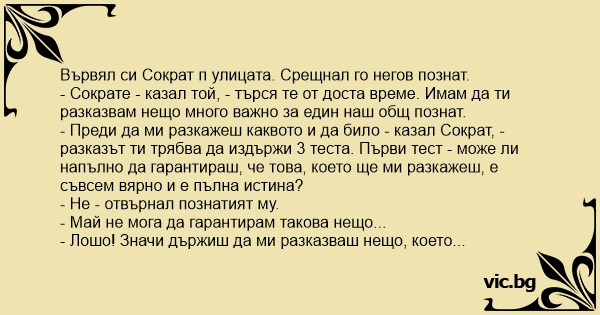 - Преди да ми разкажеш каквото и да било - казал Сократ, - разказът ти трябва да издържи 3 теста. Първи тест - може ли напълно да гарантираш, че това, което ще ми разкажеш, е съвсем вярно и е пълна истина?