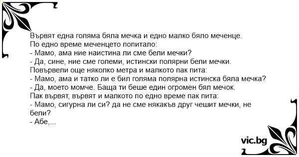 Поларно мече ја прашува мајка си: - Мамо, ја сум поларно мече? - Да бе сине! - Ама баш она вистинско бело поларно мече? - Да бе сине! - А тато исто е поларна мечка? - Да бе сине... што се...