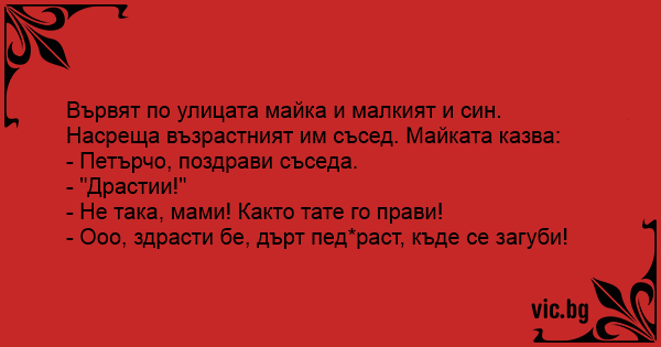 Вървят по улицата майка и малкият и син. Насреща възрастният им съсед. Майката казва: