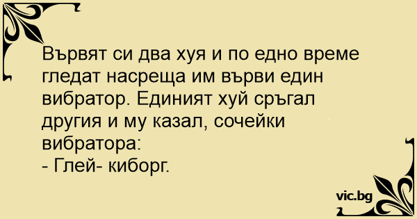 Вървят си два хуя и по едно време гледат насреща им върви един bибpatop. Единият хуй сръгал другия и му казал, сочейки вибратора: