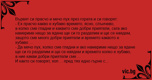 Вървят си прасчо и мечо пух през гората и си говорят:
