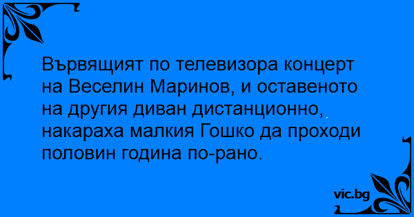Вървящият по телевизора концерт на Веселин Маринов, и оставеното на другия диван дистанционно, накараха малкия Гошко да проходи половин година по-рано.