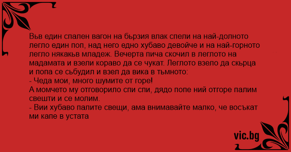 Вьв един спален вагон на бьрзия влак спели на най-долното легло един поп, над него едно хубаво девойче и на най-горното легло някакьв младеж. Вечерта пича скочил в леглото на мадамата и взели кораво да се чуkat. Леглото взело да скьрца и попа се сьбудил и взел да вика в тьмното: