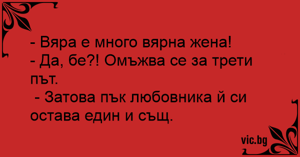 Връх на мъжката вярност: Женен вече три пъти, а любовницата му една и съща... Восхищаюсь подругой! Вот это верность! Четвертый раз замужем, а любовник все тот же! Мужская верность: женат уже в третий раз, а любовница - все одна и та же. Настоящая мужская верность - это когда уже в третий раз женат, а любовница всё та же. Што е врв на машката верност? Три пати се преженува, а цело време има иста љубовница.