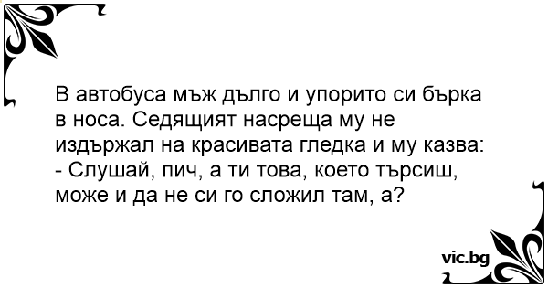 В автобуса мъж дълго и упорито си бърка в носа. Седящият насреща му не издържал на красивата гледка и му казва: