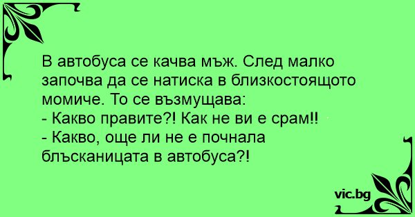 В автобуса се качва мъж. След малко започва да се натиска в близкостоящото момиче. То се възмущава: