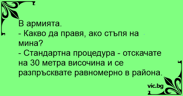 - Пане майор, а що робити, якщо я раптом наступлю на міну? - Стандартна процедура, рядовий. Доведеться підстрибнути на 30 метрів вгору і розповсюдитись по широкій території.