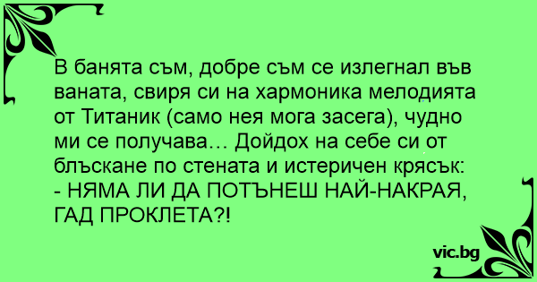 В банята съм, добре съм се излегнал във ваната, свиря си на хармоника мелодията от Титаник (само нея мога засега), чудно ми се получава… Дойдох на себе си от блъскане по стената и истеричен крясък: