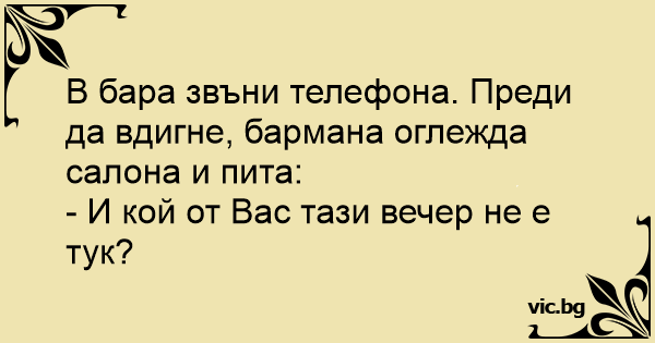 В бара звъни телефона. Преди да вдигне, бармана оглежда салона и пита: