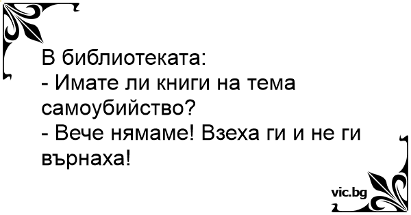 В бібліотеці: — Де я можу знайти книжки про самогубства? — На п’ятій полиці зліва. — Але там немає жодної книги. — Та їх просто ніхто не повертає...