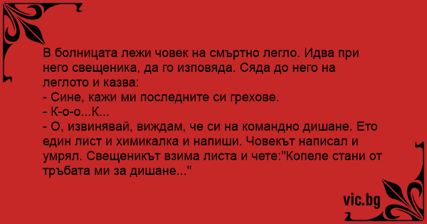 - О, извинявай, виждам, че си на командно дишане. Ето един лист и химикалка и напиши. Човекът написал и умрял. Свещеникът взима листа и чете:"Koпeлe стани от тръбата ми за дишане..."