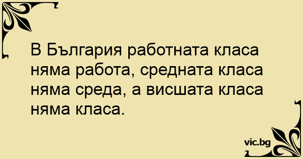 В България работната класа няма работа, средната класа няма среда, а висшата класа няма класа.