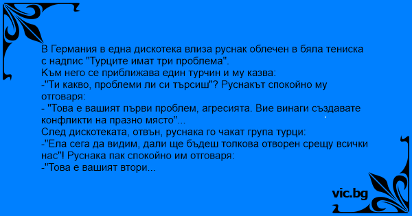 Ateina rusas į diskoteką Vokietijoje. Užsidėjęs ryškius marškinėlius su užrašu “Turkai turi 3 problemas”. Iškart prisistato turkas ir pareikalauja pasiaiškinti dėl įžulumo ir nusiimt maikoną. -...