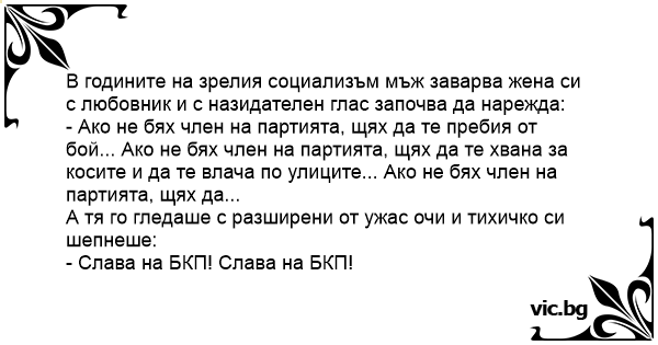 В годините на зрелия социализъм мъж заварва жена си с любовник и с назидателен глас започва да нарежда: