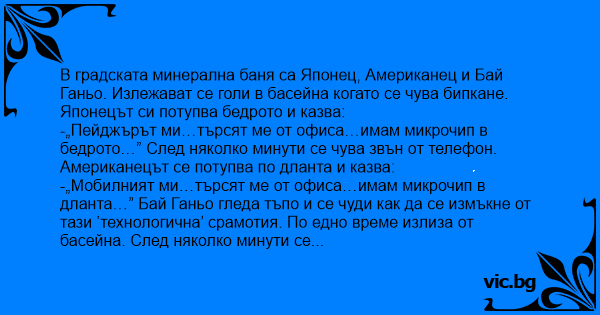 В градската минерална баня са Японец, Американец и Бай Ганьо. Излежават се голи в басейна когато се чува бипкане. Японецът си потупва бедрото и казва: