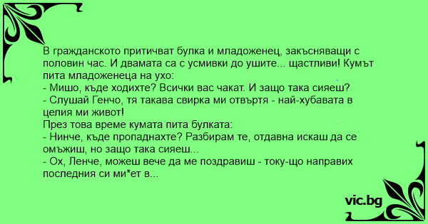 В гражданското притичват булка и младоженец, закъсняващи с половин час. И двамата са с усмивки до ушите... щастливи! Кумът пита младоженеца на ухо: