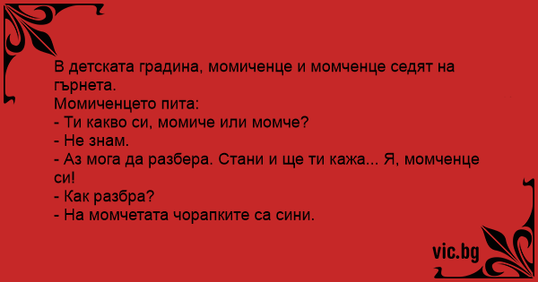 Chlubí se v porodnici jeden novorozenec druhému: „Já jsem kluk.” „Jak to víš?” diví se druhý. „Počkej chvilku, až odejde sestra. Já ti to ukážu.” „Tak to ukaž!” naléhá druhý novorozenec, když...