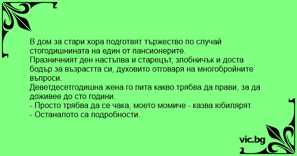 Деветдесетгодишна жена го пита какво трябва да прави, за да доживее до сто години.