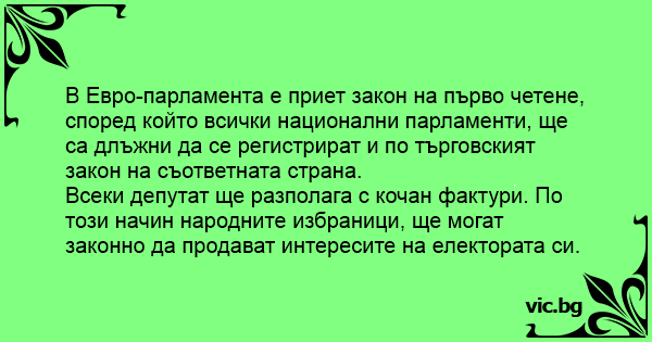 В Евро-парламента е приет закон на първо четене, според който всички национални парламенти, ще са длъжни да се регистрират и по търговският закон на съответната страна.